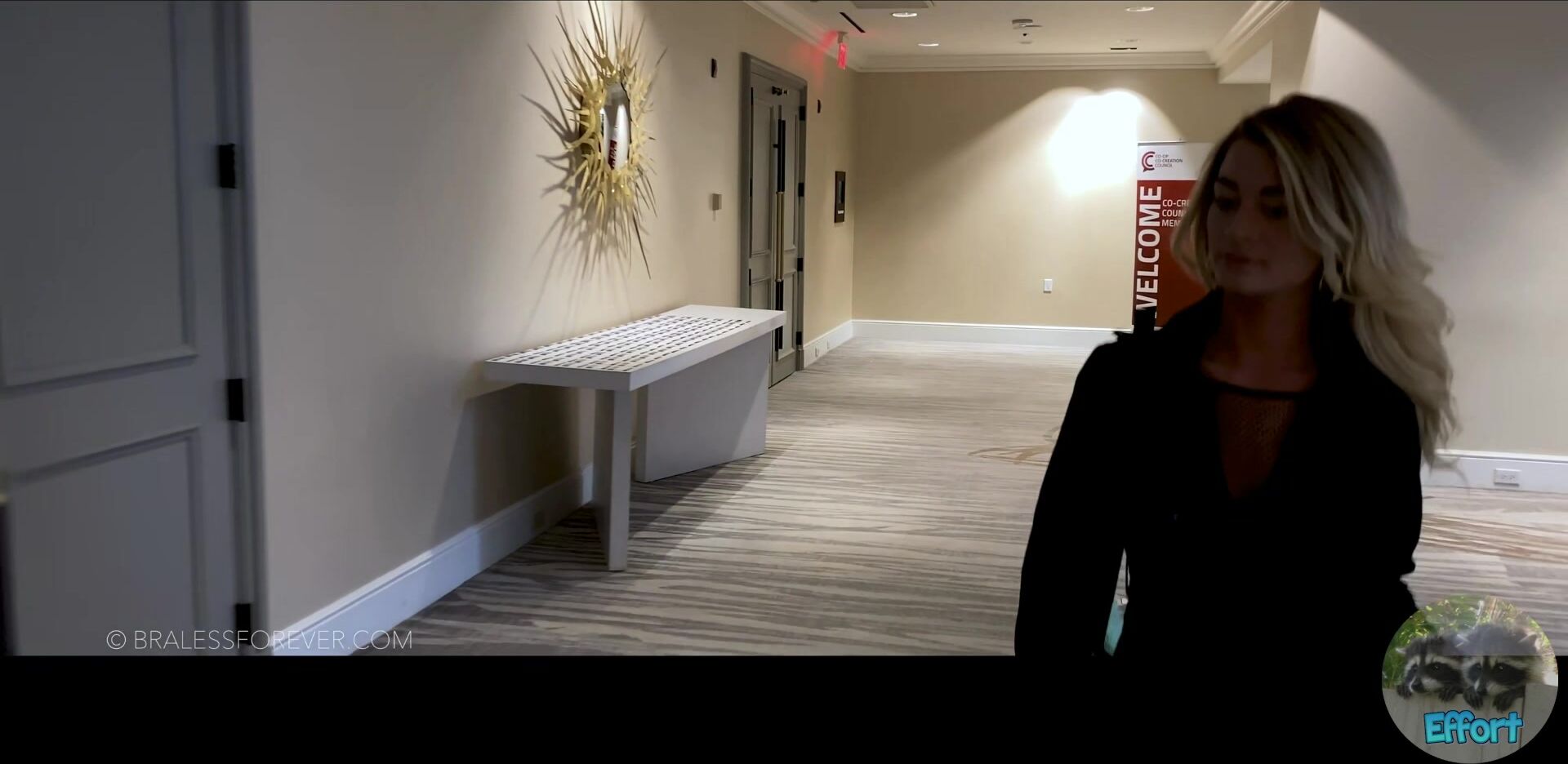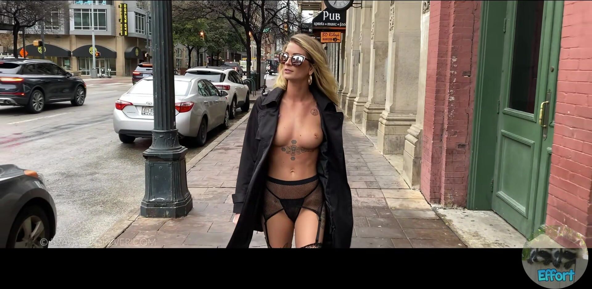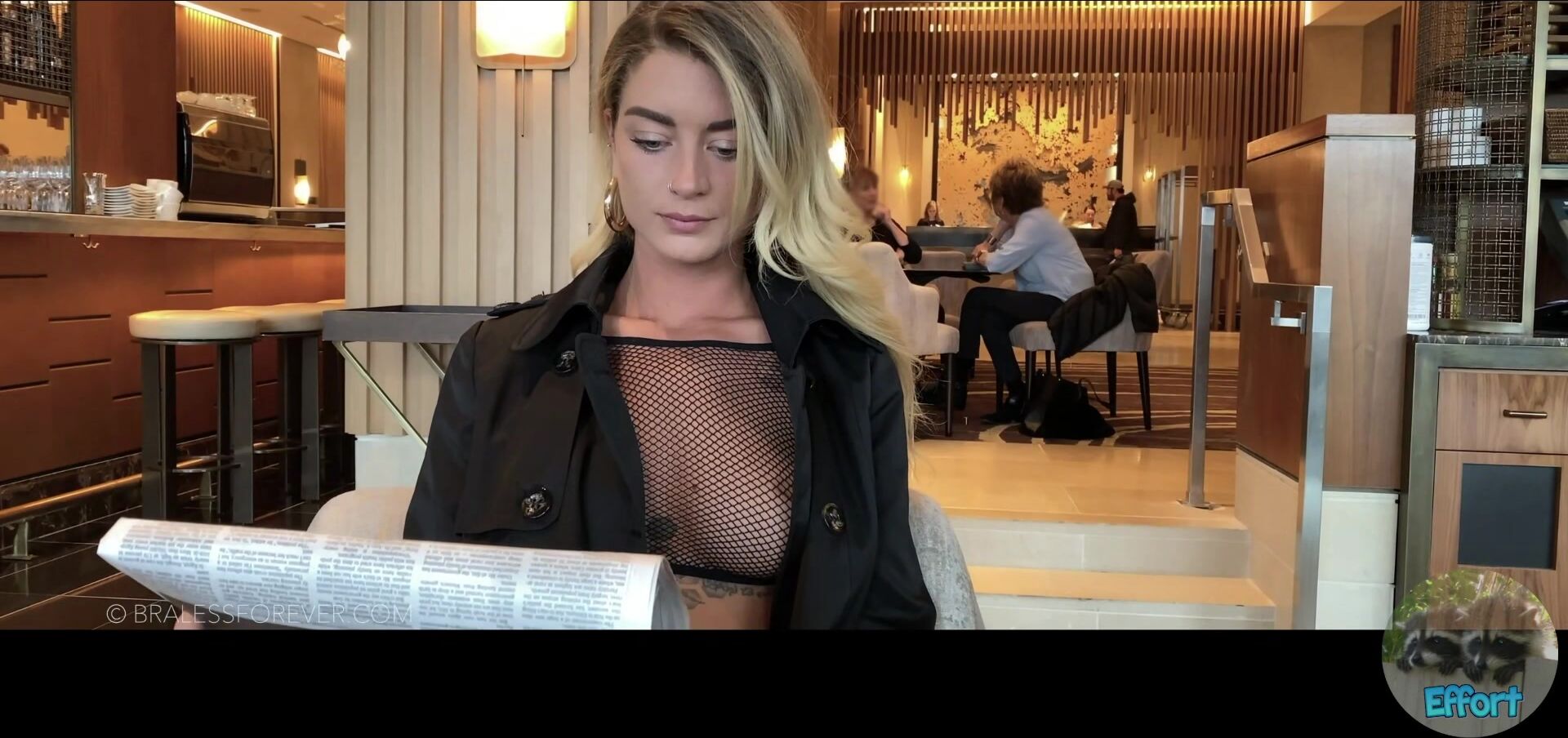 Blonde babe teases in see-through fishnet with Bralessforever showing her public escapades in this exclusive video.