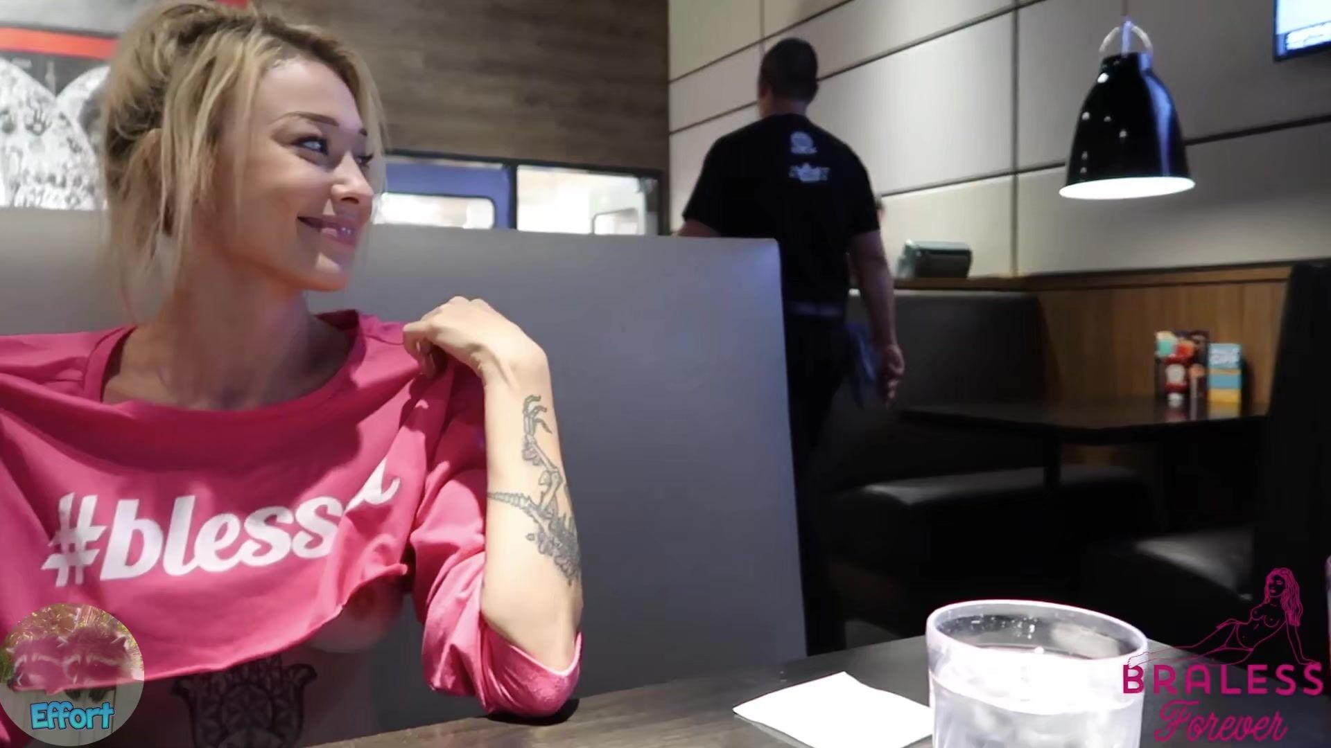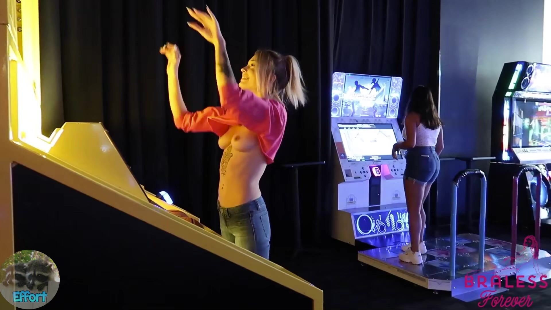 BralessForever goes braless in a public arcade showing her perky tits in this naughty public adventure video