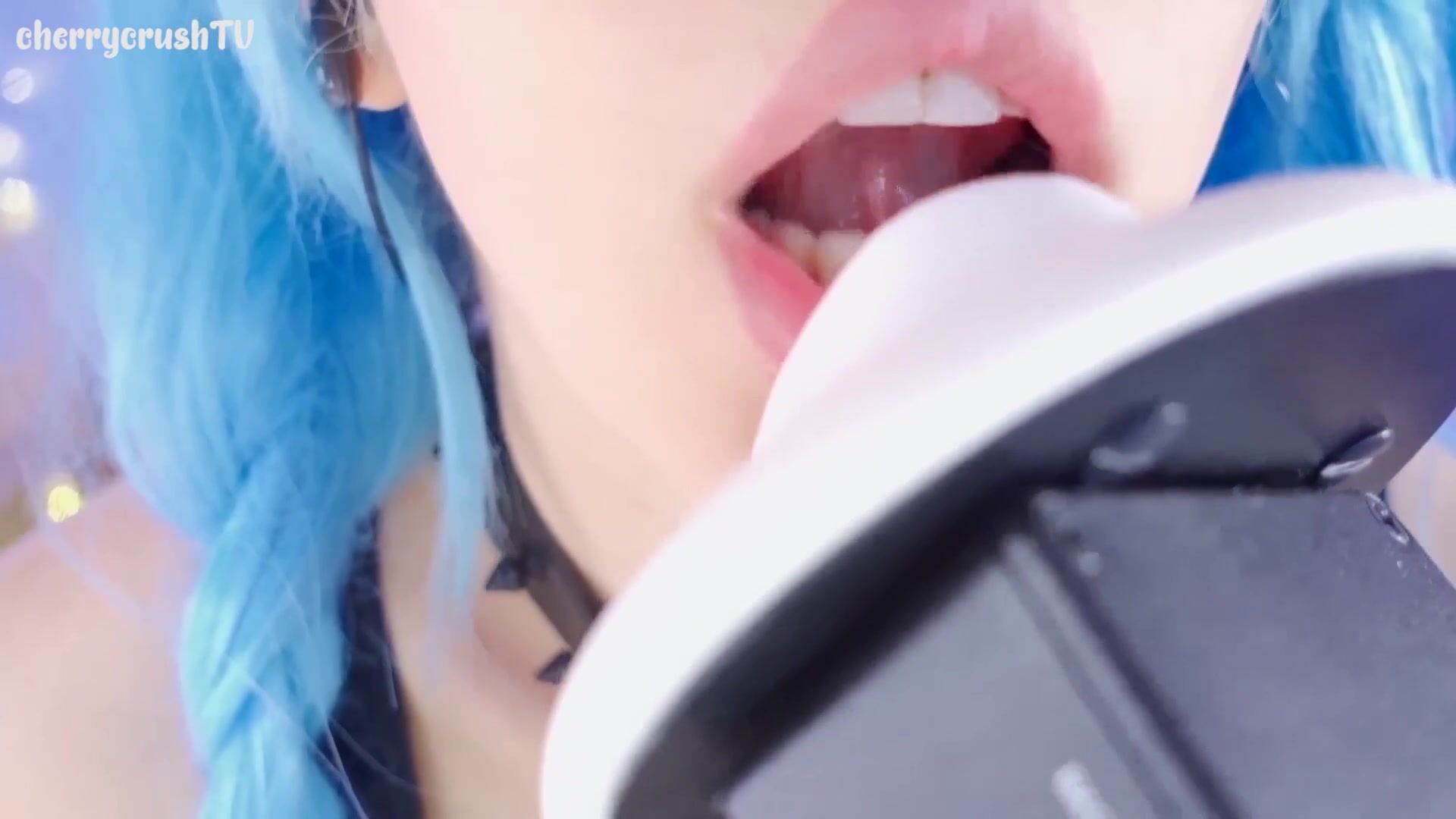 Hot blue-haired cherrycrushTV play with her mic in sexy lingerie in this ASMR video