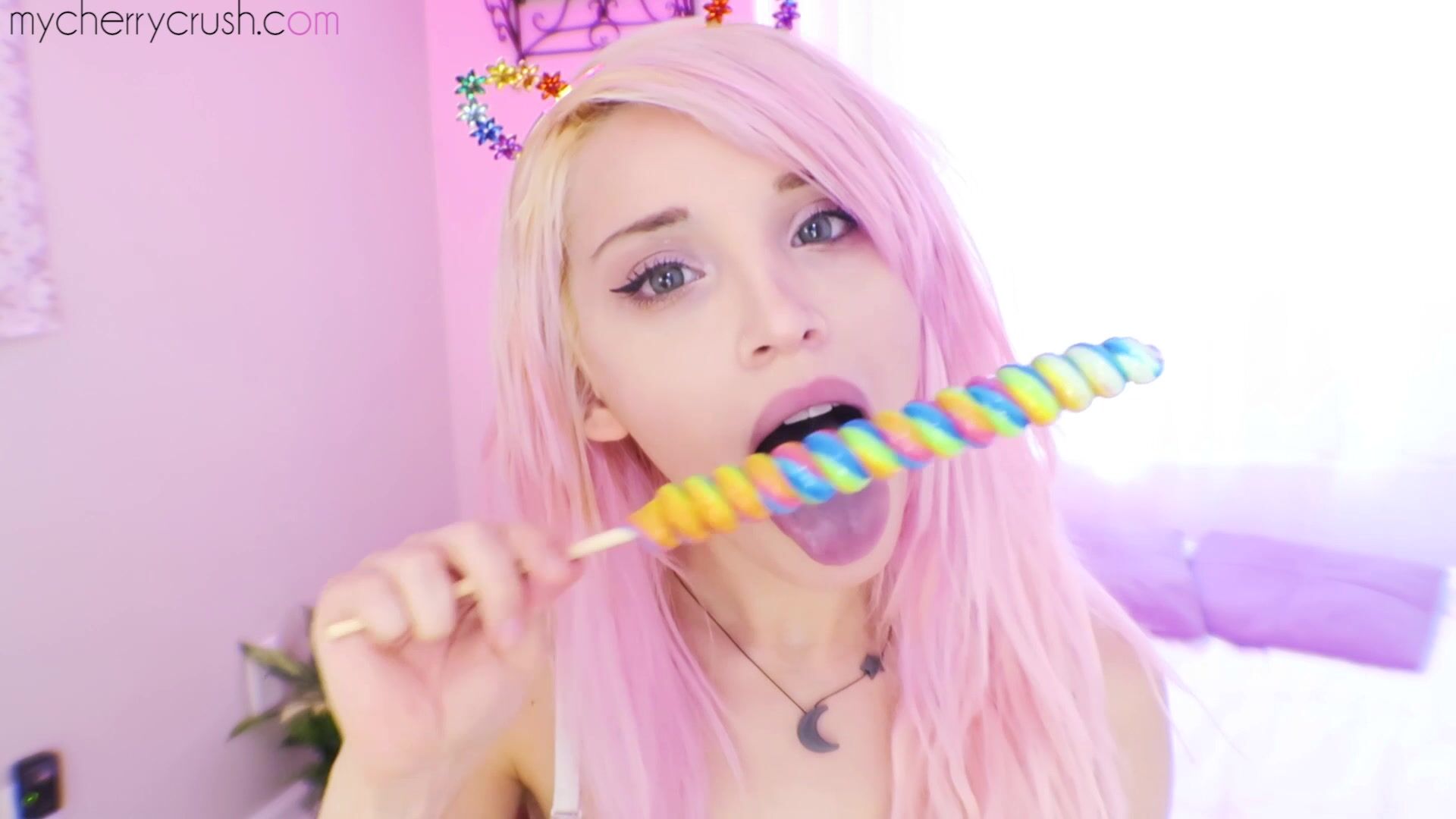 Cute pink-haired MyCherryCrush play with a lollipop and toys her pussy with a dildo in this playful solo video.