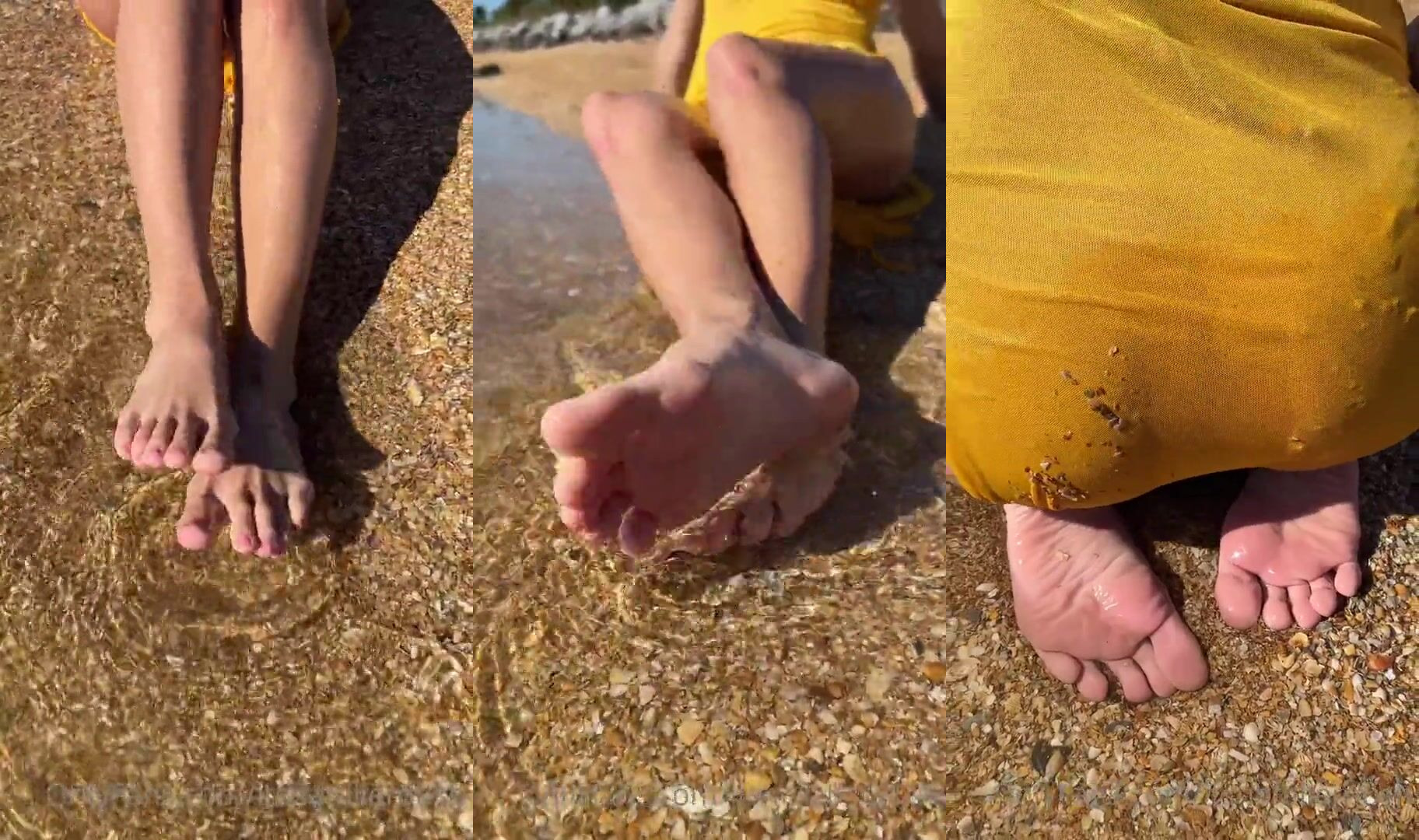 Video of Natalie Roush teasing her feet on the beach while wearing a yellow outfit.