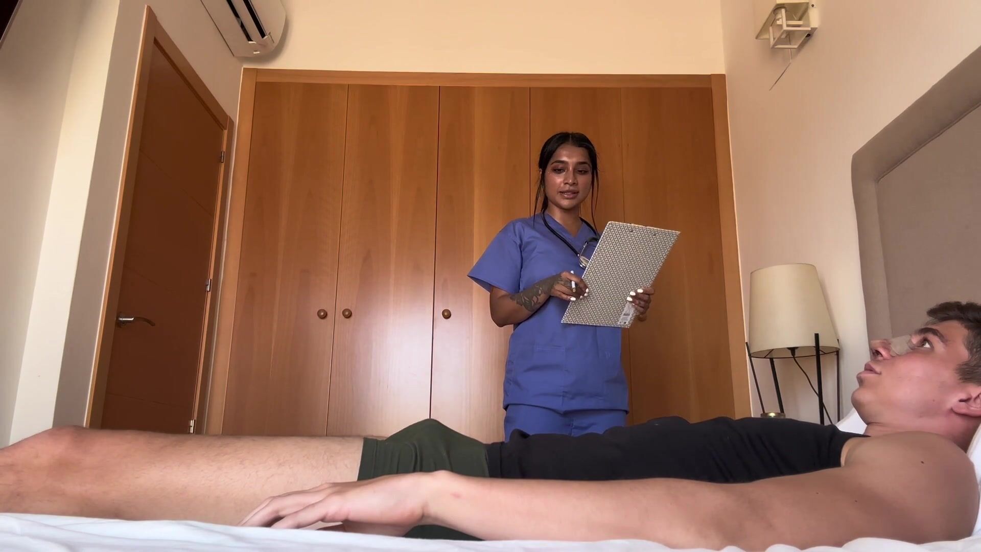 Yasmina Khan teases in nurse outfit servicing Brady Buds cock till he blows his load in her wet pussy ending with a creampie in this hardcore hospital fuck video